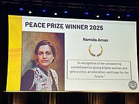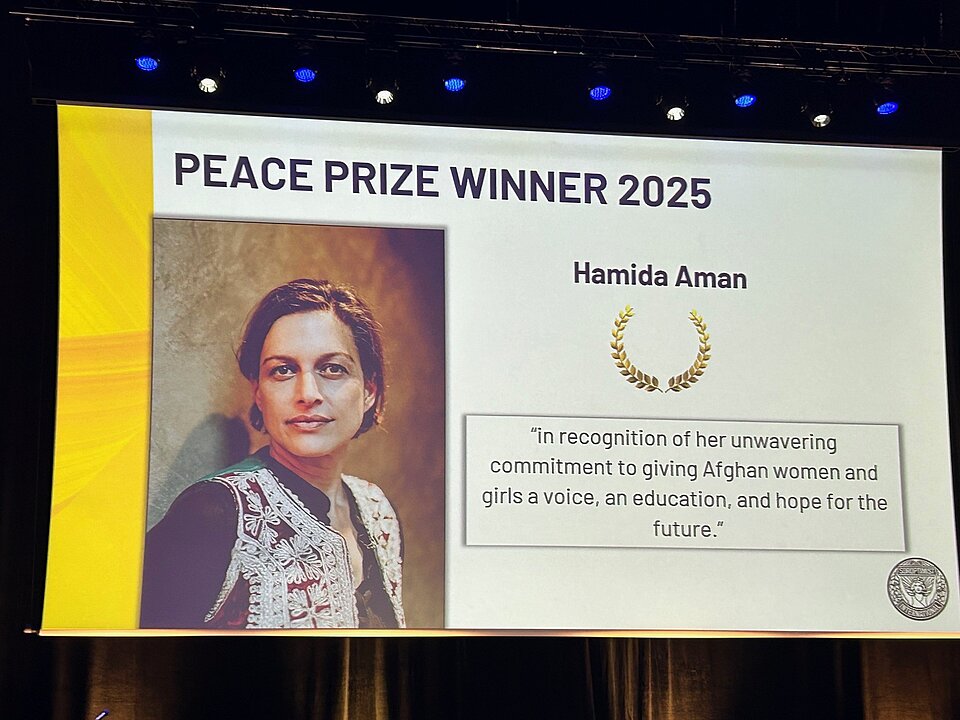 Der mit 20.000 Euro dotierte Internationale Friedenspreis von Soroptimist International of Europe (SIE) wurde Hamida Aman am 25.10.2025 auf dem 22. Kongress von SIE in Krakau verliehen. In ihrer Laudatio würdigte SIE Immediate-Pastpräsidentin Carolien Demey Amans außergewöhnliches Engagement für die Bildung und Selbstbestimmung von Frauen in Afghanistan.